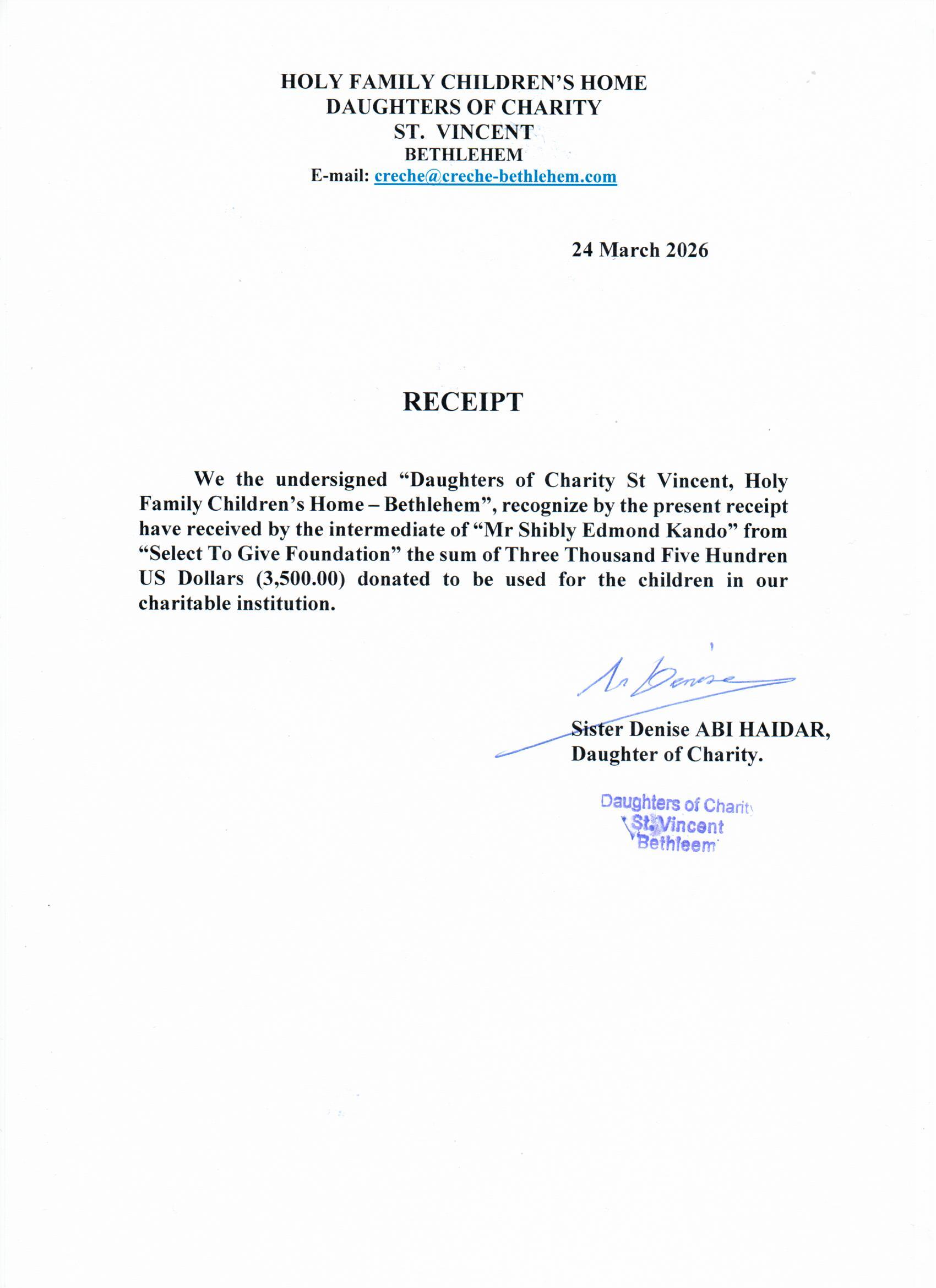 Thanks letter to Select to Give